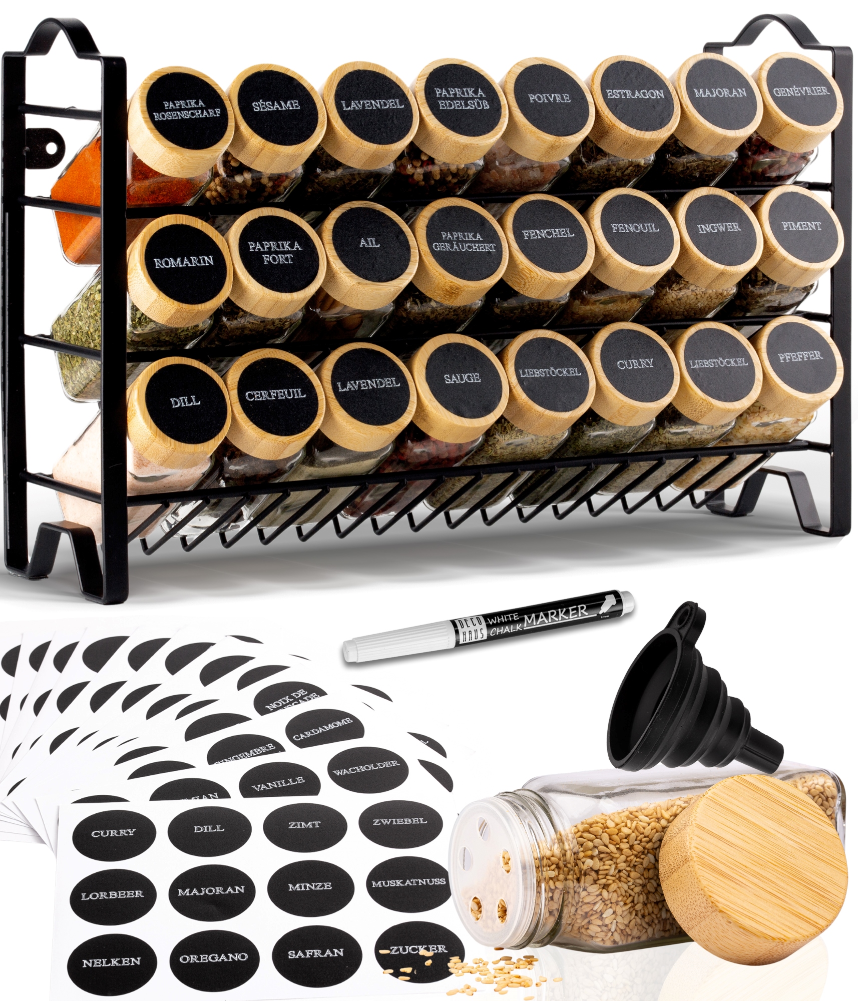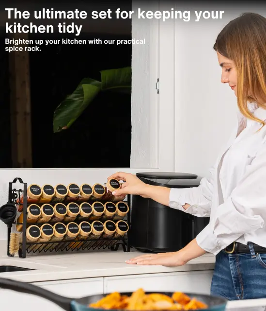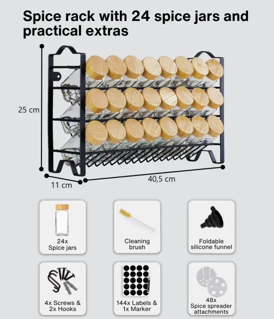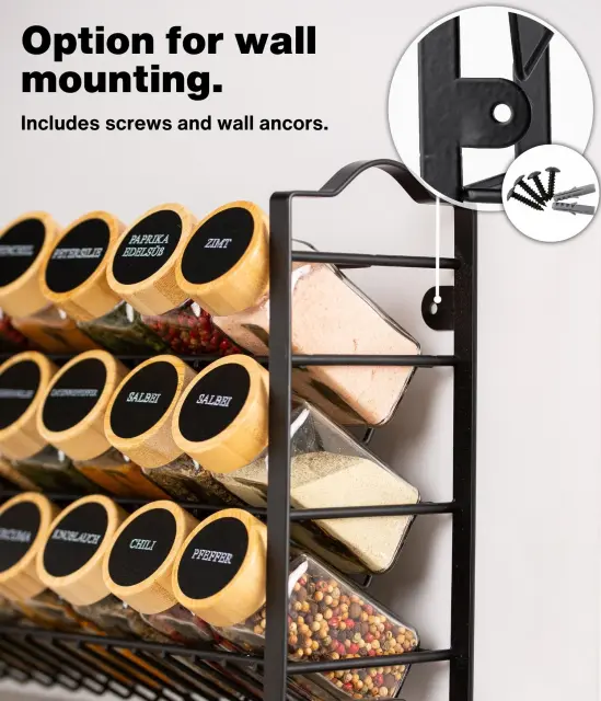 Poslovite se od neurejenega pulta! S tem kuhinjskim kompletom imate vse svoje najljubše začimbe vedno pri roki. Komplet vsebuje stojalo za začimbe, lepilne blazinice, 24 kozarčkov za začimbe, 48 praznih in prednatisnjenih nalepk (v francoščini in nemščini), krtačko, kredno pisalo, dva pokrovčka za stresanje različnih velikosti, lijak, kaveljčke in vijake za pritrditev na steno.