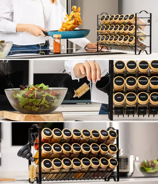 Ne glede na to, ali pri svoji kuhi uporabljate le nekaj svojih najljubših začimb, ali pa radi mešate in kombinirate različne vrste začimb, boste tu našli rešitev zase! Vse svoje začimbe shranite v 24 ločenih kozarčkov. S tem trinivojskim stojalom za organizacijo lahko začimbe razporedite po želji. Kozarčki so izdelani iz prozornega stekla, zato vam ni treba ugibati, kaj je v njih, niti preverjati, ali vam jih je morda že zmanjkalo.