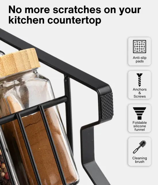 Naše stojalo je izdelano iz trpežne kovine. Okvir zdrži popolnoma napolnjene kozarčke z začimbami. Je tudi odporen na rjo in korozijo.