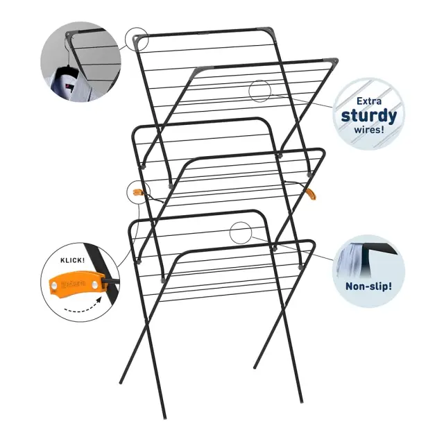 Stabilno in praktično sušilno stojalo z elegantno “Pop‑Up” konstrukcijo, zasnovano za enostavno vsakodnevno uporabo. Njegova 18‑metrska sušilna površina nudi dovolj prostora za sočasno obešanje velike količine perila. Opremljeno je z zaklopnim mehanizmom, ki zagotavlja dodatno stabilnost, ko je stojalo odprto, ter tako poveča varnost med uporabo. Zaradi kompaktnega dizajna je stojalo mogoče postaviti neposredno v kad, kar je idealno za preprečevanje kapljanja vode na tla. S težo le 3 kg je zelo enostavno za premikanje, prenašanje in shranjevanje. Premer cevi 12 mm pa zagotavlja dobro stabilnost in vzdržljivost.