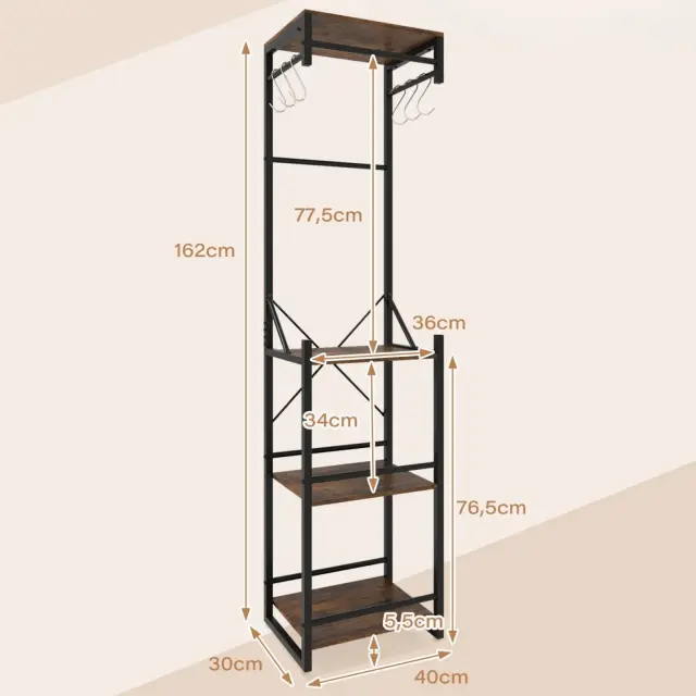 S tem vsestranskim prostostoječim obešalnikom, ki poskrbi, da so vaša oblačila urejena in na dosegu roke, vzpostavite red. Robusten kovinski okvir z napravami proti prevračanju in stabilno trikotno obliko zagotavlja zanesljivo oporo in varnost. Več vodil za oblačila, kavljev in polic zagotavlja dovolj prostora za jakne, klobuke, torbe, čevlje in okrasne predmete. Ta eleganten kos pohištva v industrijskem slogu, ki je idealen za hodnike, spalnice ali dnevne sobe, združuje funkcionalnost in eleganco. Poslovite se od nereda in uživajte v lepo urejenem domu s tem prostorsko varčnim obešalnikom.