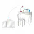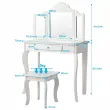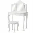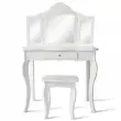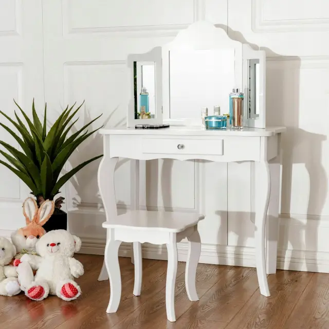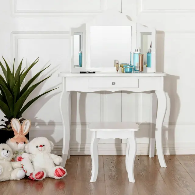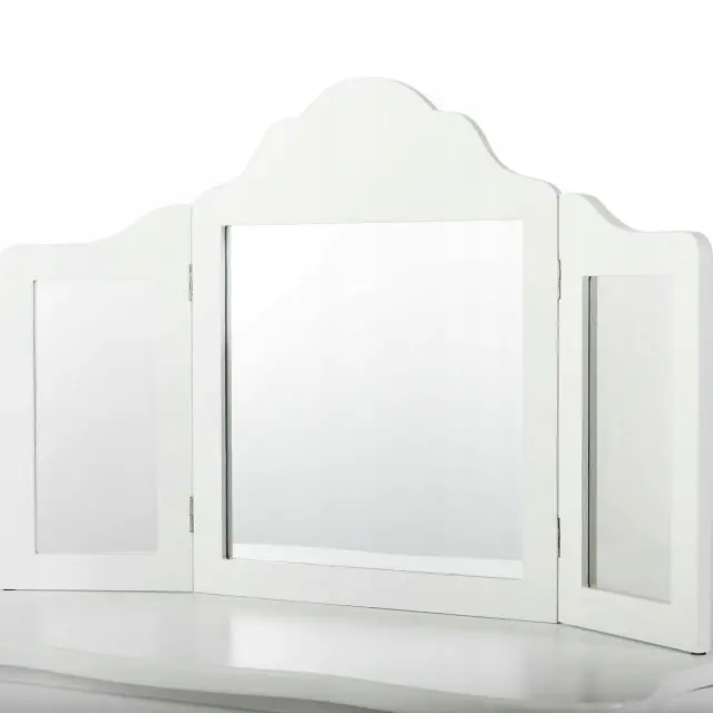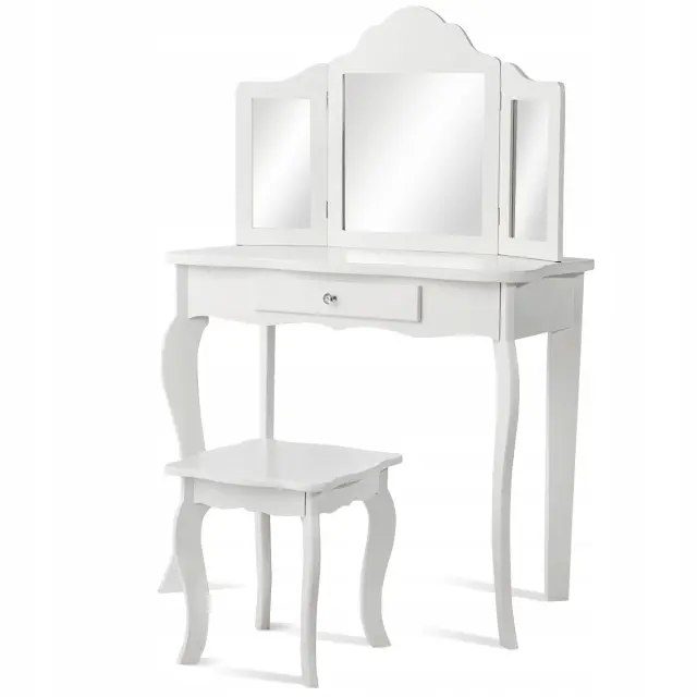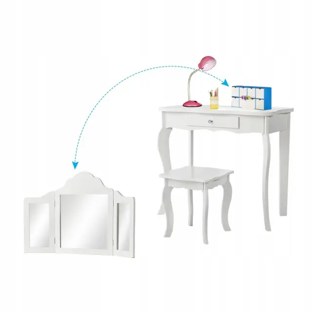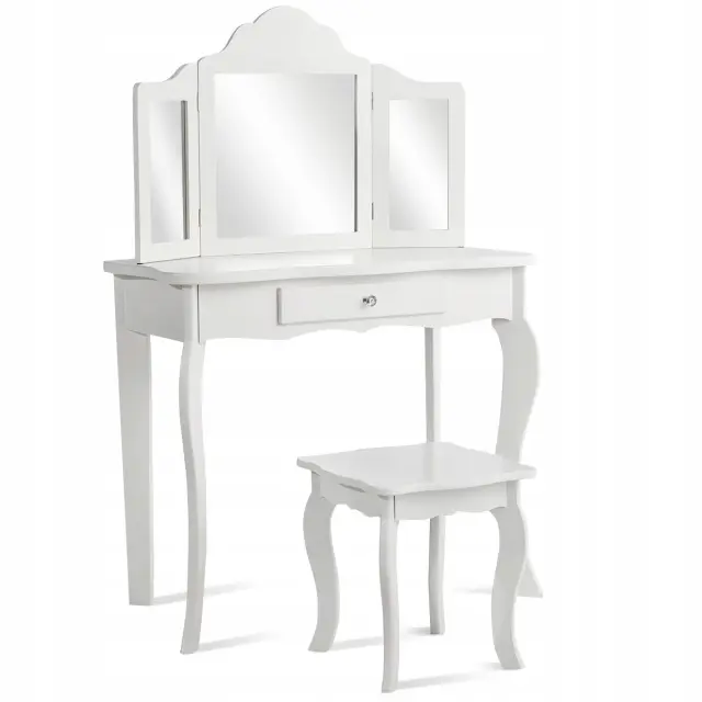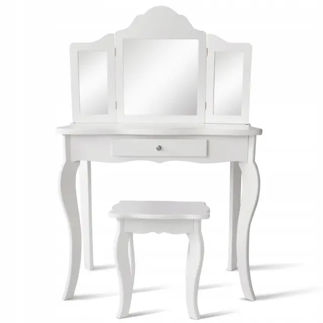 Vsako dekle sanja o tem, da bi bilo sijoča princesa. S tem izvrstnim toaletnim kompletom se ji bodo sanje uresničile. Izbrani material in noge iz masivnega borovega lesa zagotavljajo trdno in stabilno strukturo za brezskrbno uporabo. Z edinstvenim trojnim zložljivim ogledalom toaletna mizica ponuja veliko udobja za popoln in jasen pogled. Osrednji predal in prostorna mizica zagotavljata dovolj prostora za shranjevanje in razstavljanje nakita, kozmetike in drugih lepotnih pripomočkov. Poleg tega lahko ta funkcionalni komplet toaletne mizice uporabite kot pisalno ali delovno mizo, če odstranite zgornji del ogledala, da bi zadostili različnim potrebam. Nedvomno je idealno darilo za vaše najmlajše za rojstne dneve, praznike ali druge posebne dni.