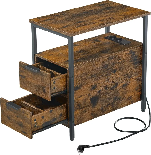 Vgrajen napajalni trak: z 2 vhodoma AC, 2 vhodoma USB in 2 m polnilnim kablom lahko polnite svoje naprave. To vam tudi omogoča, da se izognete zamotanim kablom in tako ustvarite urejeno okolje [Veliko prostora za shranjevanje] Naša kompaktna stranska mizica ponuja vsestranske možnosti shranjevanja - 2 predala z zamenljivimi pregradami, 2 odprti polici za enostaven dostop in celo držalo za revije na zadnji strani Vzdržljiva in trpežna: ta nočna omarica, izdelana iz jekla in lesene iverne plošče, zagotavlja dolgo življenjsko dobo. Podpira do 200 funtov in zagotavlja zanesljivo podporo za vse, kar potrebujete v postelji [Premišljene podrobnosti] Z 2 ročajema na vrhu je to mizico preprosto prenašati. Zahvaljujoč drsnim premium vodilom lahko predale gladko izvlečete. Zaradi prefinjenega dizajna je ta mizica enostavna za uporabo [V vsakem prostoru doda rustikalni pridih] To ozko nočno omarico lahko uporabljate kot stransko mizico, nočno omarico ali mizico na kavču. Njena rustikalna zasnova doda pridih rustikalnega šarma vaši dnevni sobi, spalnici ali kjerkoli ga potrebujete [Primerno za majhne prostore] Z velikostjo 60 x 35 x 61 cm (D x Š x V) se ta tanka nočna omarica zlahka prilega v prostore med stoli, ob kavču ali posteljah Podrobnosti o izdelku: Barva: Vintage Brown Classic BlackMaterial: Lesene iverne plošče, Velikost jekla: 60 x 35 x 61 cm (DXŠXV). Teža: 13,8 kg. maks. STATIČNA Površinska nosilnost: 72,5 kg. maks. Statična obremenitev na predal: 2,3 kg. maks. Statična obremenitev na sredini police: 11,3 kg. maks. Statična obremenitev nosilca nabojnika: 2,3 kg. maks. Skupna statična nosilnost: 200 lbs Vključuje: 1 x stransko mizico, 1 x paket dodatne opreme, 1 x priročnike (angleščina ni zagotovljena)