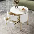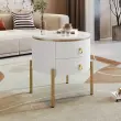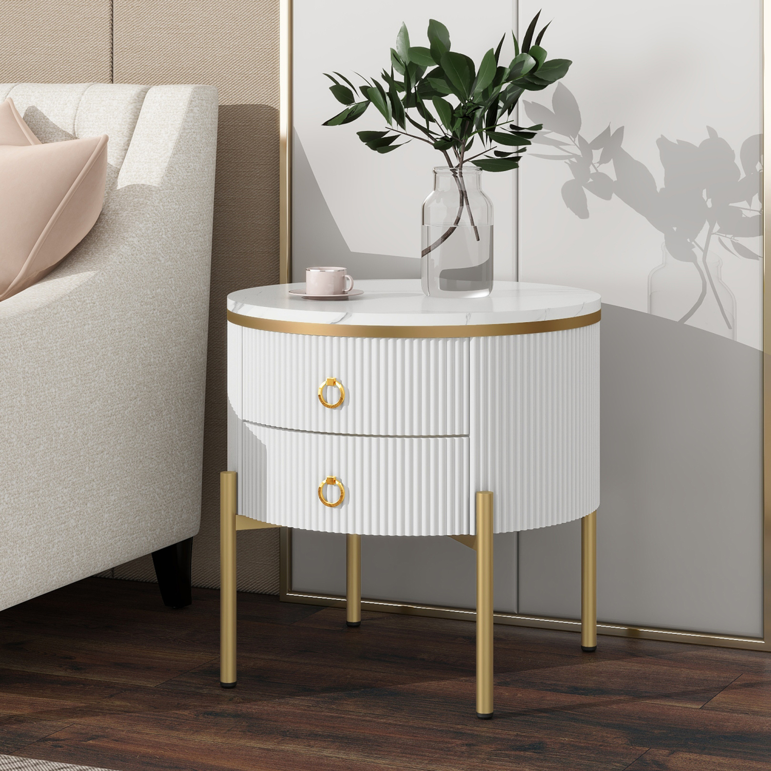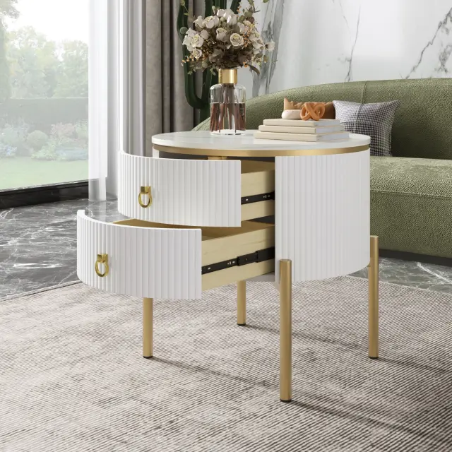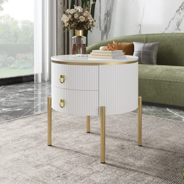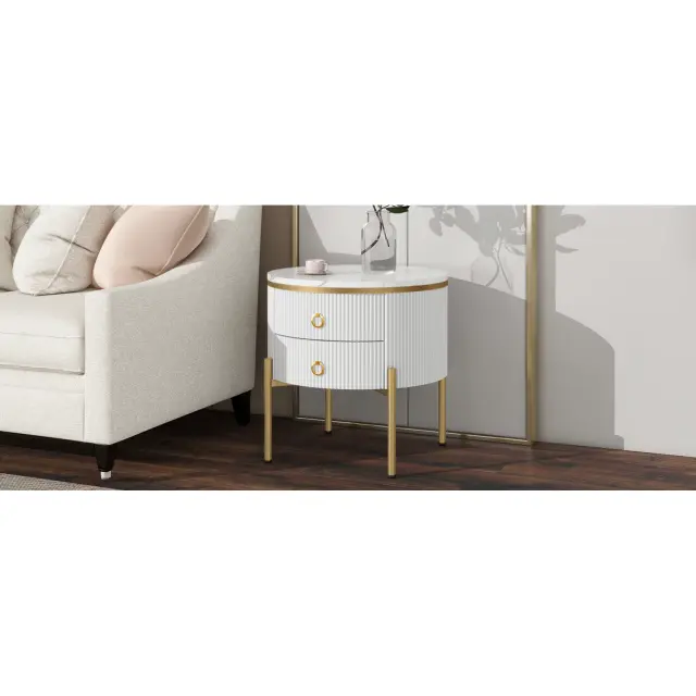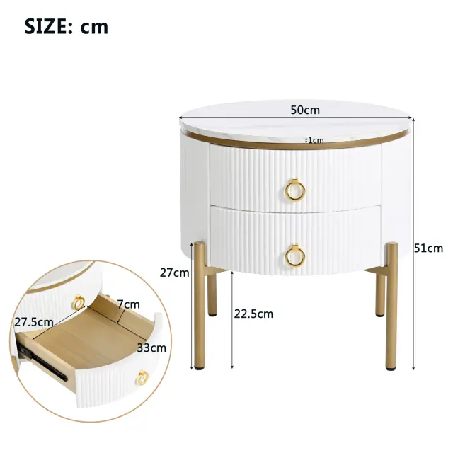 Elegantna luksuzna stranska mizica z marmorno ploščo, zlatimi poudarki in dvema predaloma. Nastavljive noge za individualno nastavitev višine. (50x50x51cm)