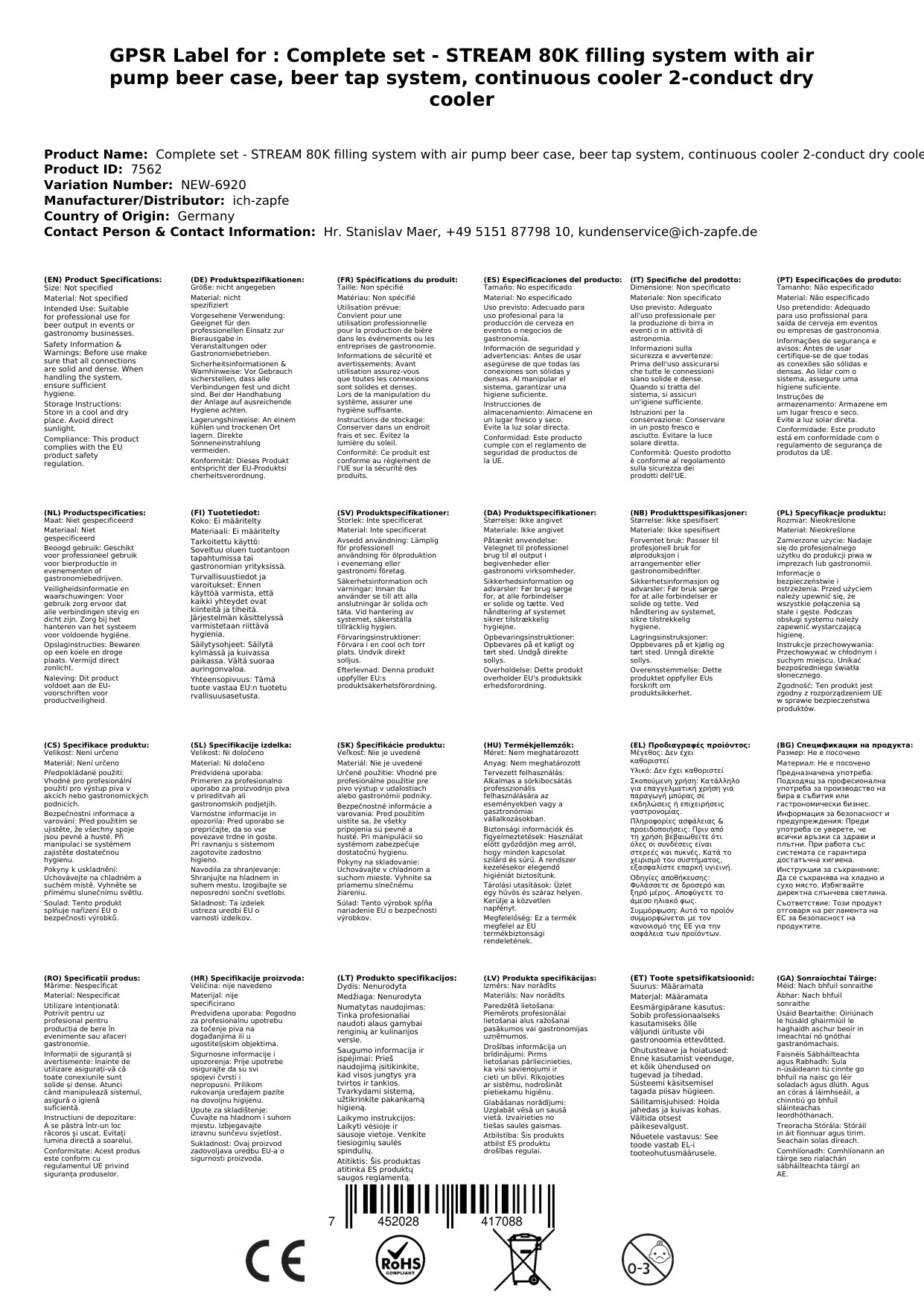 Tehnični podatki: Teža 45 kg, opremljen z 7 mm cevmi. Mere (Š x G x V): 255 x 635 x 510 mm (vključno s kapljično posodo). Napajanje: 220 V, 50 Hz, 804 W, 4,5 A. Kompresor: 3/8 PS. Število linij: 2 x vrsti piva. Ohišje: Kovinsko, prašno barvano, odporno proti rji.