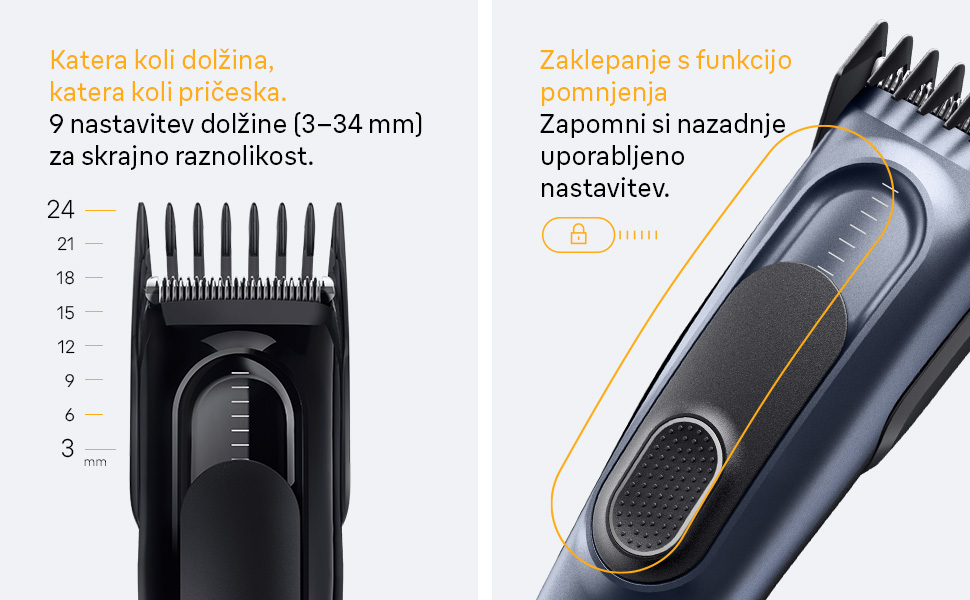 9 dolžin: uporabite z nastavkom ali brez njega. Zaklepanje s funkcijo pomnjenja si zapomni in fiksira zadnjo uporabljeno nastavitev, da je striženje doma še bolj enostavno.