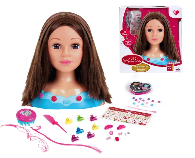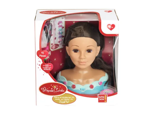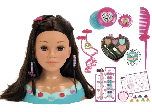 Glava za ličenje in friziranje 'Mia' Čudovita, 27 cm visoka stilistična glava za otroke s pralnimi in česljivimi lasmi vključuje dermatološko testiran komplet kozmetike v obliki srca in lasne dodatke. Kozmetično srce vsebuje lip gloss, senčilo za oči in rdečilo za lica. Kot lasni dodatki in frizerski pripomočki so vključeni krtača, glavnik, dva pramena las, komplet lasnih perlic, sedem lasnic, dve sponki za lase, osem dekorativnih zatičev za trup in sponke za lase, ter list nalepk, navodila s stilskimi nasveti in še veliko več.