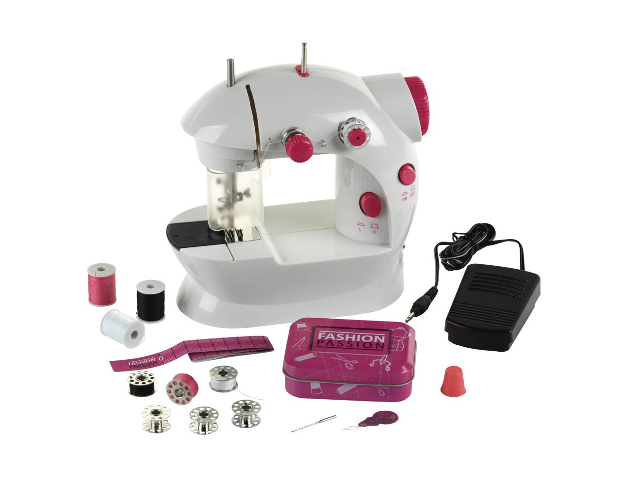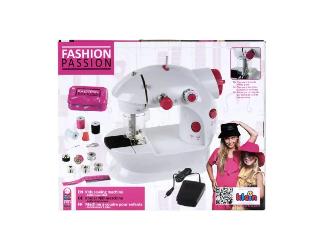 Z Otroškim šivalnim strojem podjetja Klein Toys je varnost na prvem mestu: prozoren zaščitnik preprečuje, da bi se prstki malih otrok dotaknili igle. Šivalna igla ima dve hitrostni nastavitvi in lahko šiva kose blaga skupaj z uporabo zgornje in spodnje niti. Otroški šivalni stroj deluje na baterije in ga je mogoče upravljati bodisi s stopalno stopalko bodisi z ročnim kolescem. Primeren je za otroke, stare osem let in več, ki imajo potrebne ročne spretnosti in potrpljenje, da ga navijejo ali znova navijejo iglo, če se nit pretrga. Otroški šivalni stroj Fashion Passion je opremljen z različnimi dodatki: rezervno iglo, pomoč pri navijanju, ščitnik za prste, trak za merjenje in nit. Vse, od ščitnika za prste do ročnega kolesa za ročno delovanje, je v privlačnem roza-beli oblikovanju, ki bo še posebej všeč bodočim mladim oblikovalcem.