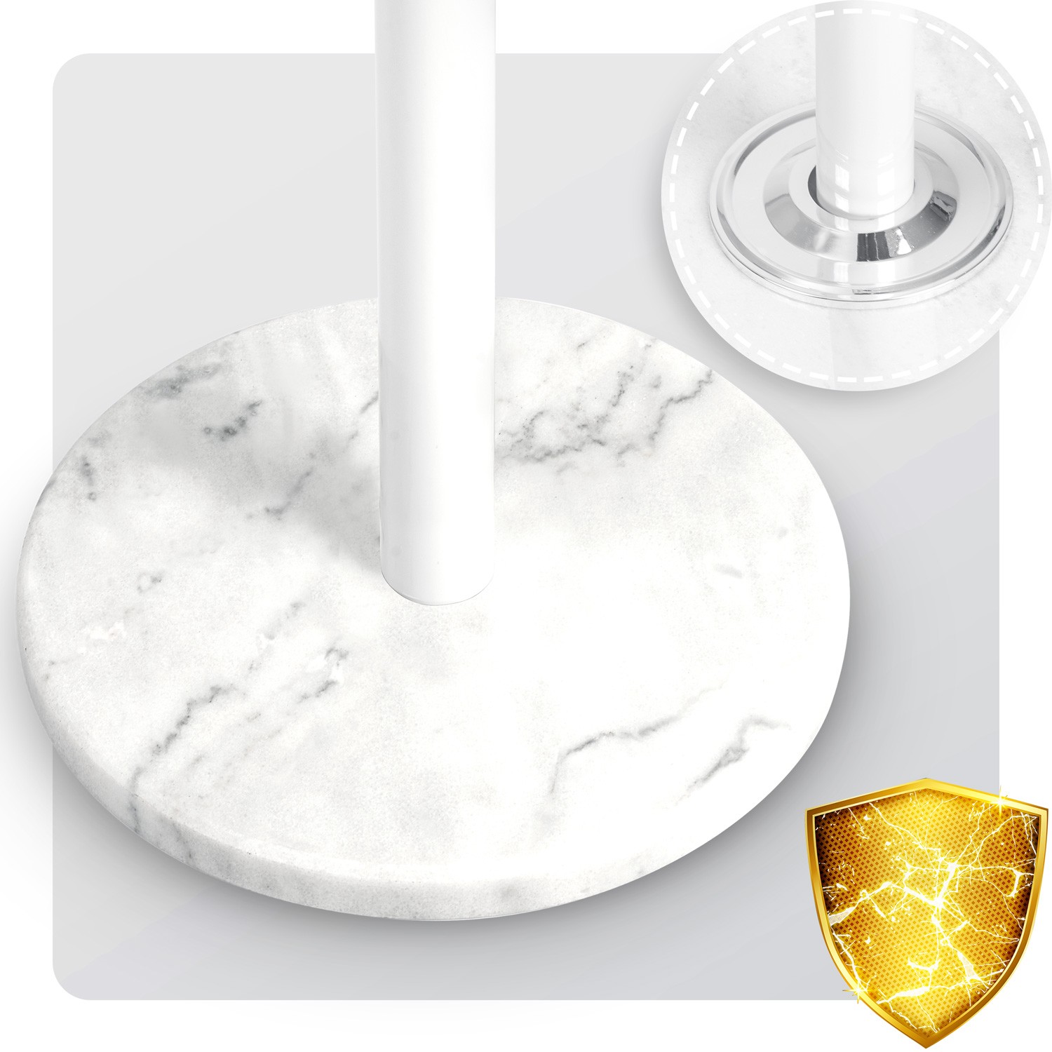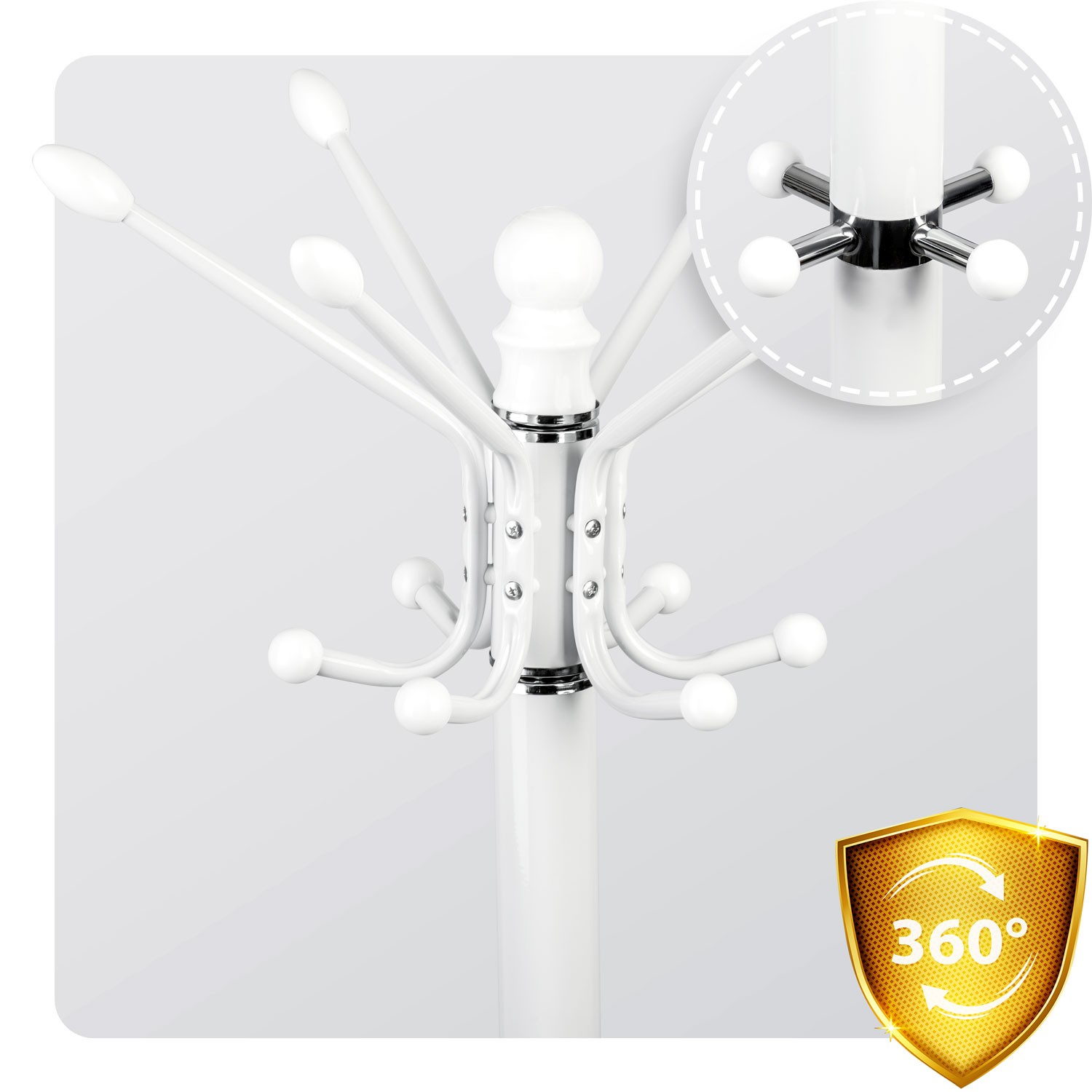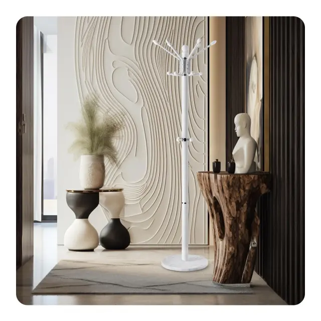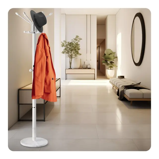Elevate your organization with the Massido 684301 Standing Clothes Rack featuring a chic marble base. This elegant hanger enhances your hallway while providing ample storage with 16 hooks for hats, coats, handbags, and children's jackets. The upper part rotates 360 degrees for easy access, and the sturdy marble base adds sophistication. With a height of 175 cm and a support capacity of 20 kg, it includes a FREE silver imitation cover to match your decor. Each marble pattern is unique, ensuring your rack is one-of-a-kind.