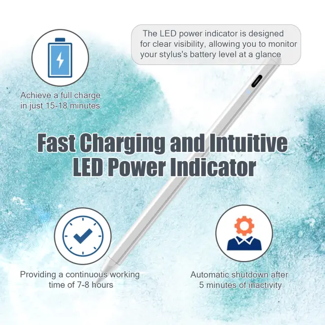 Hitro polnjenje in intuitivni LED indikator napajanja: Izkusite izjemno hitrost polnjenja in udobje z našim pisalom, ki vključuje vrata za polnjenje USB-C in vgrajeno baterijo s 130 mAh. Dosezite popolno napolnitev v samo 15-18 minutah, kar zagotavlja neprekinjen delovni čas 7-8 ur. LED indikator napajanja je zasnovan za jasno vidljivost, kar vam omogoča, da na prvi pogled spremljate nivo baterije vašega pisala. Funkcija samodejnega izklopa po 5 minutah nedejavnosti zagotavlja energetsko učinkovitost in preprečuje nepričakovane izklope zaradi prazne baterije med uporabo.