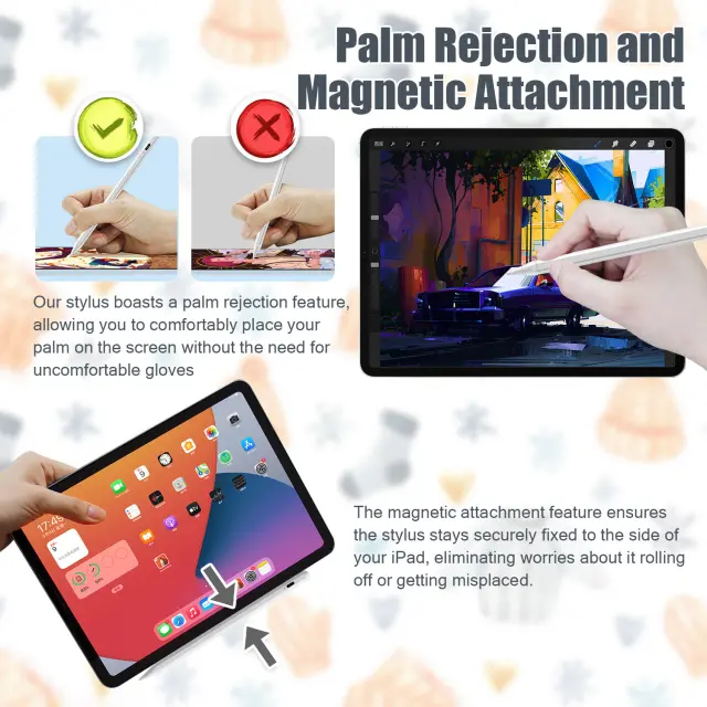 Zavrnitev dlani in magnetni pristavek: Naše pisalo se ponaša s funkcijo zavrnitve dlani, kar vam omogoča, da dlan udobno položite na zaslon, ne da bi potrebovali neudobne rokavice. Funkcija magnetne pritrditve zagotavlja, da pisalo ostane varno pritrjeno ob strani vašega iPada, kar odpravlja skrbi, da bi se odkotalilo ali izgubilo. Z lahkoto nosite svoje pisalo, kamorkoli greste, z zaupanjem v njegovo stabilnost.