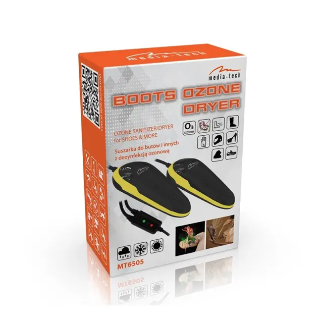 Sušilnik za čevlje Media-Tech MT6505 nežno odstrani vlago iz notranjosti čevljev zahvaljujoč samodejno izbrani temperaturi sušenja. Funkcija steriliziranja "ozon" pa uniči 99,7 % gliv in cca. 650 vrst bakterij.