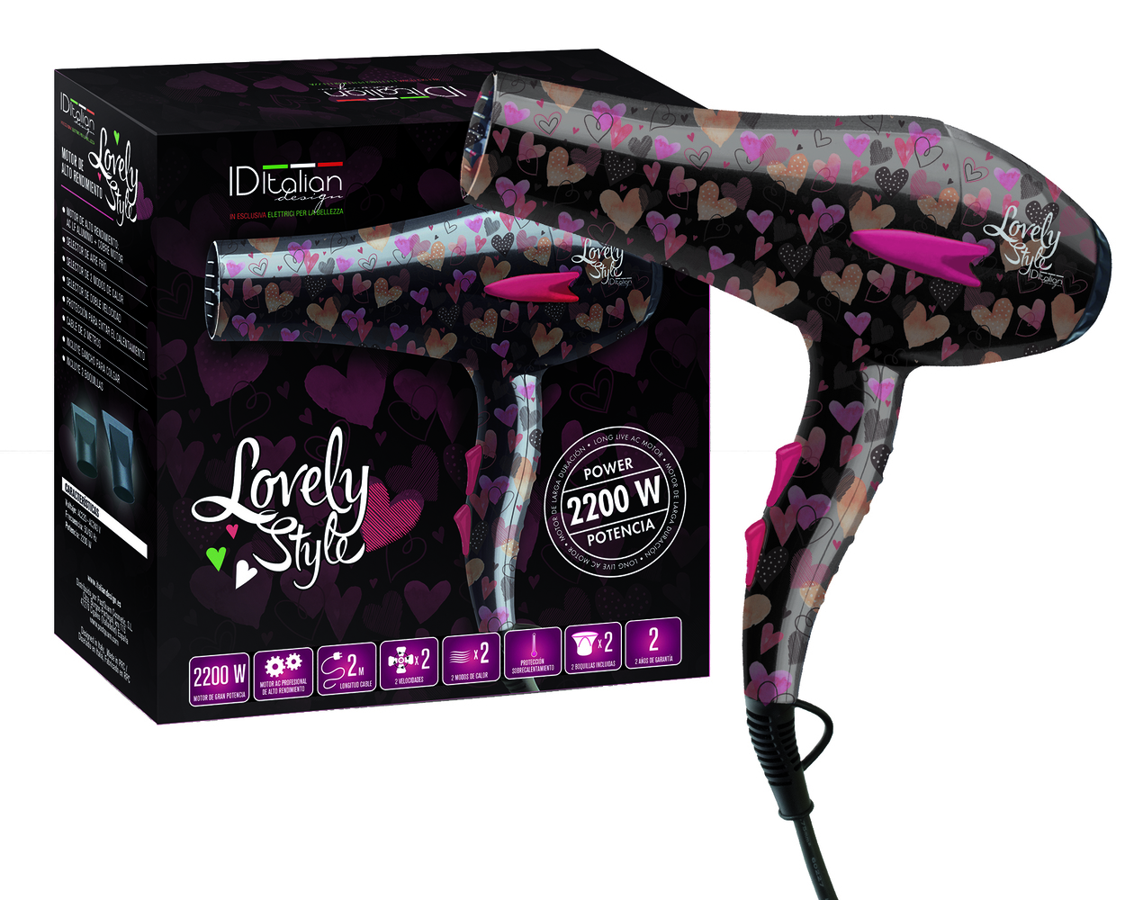 Sušilnik las 2200W Lovely Style - Visoko zmogljiv motor: AC. - Izbirnik hladnega zraka. - Izbirnik za 2 načina ogrevanja. - Dvojni izbirnik hitrosti. - Zaščita za preprečevanje pregrevanja. - Dvometrski kabel. - Kljuka in dve šobi.