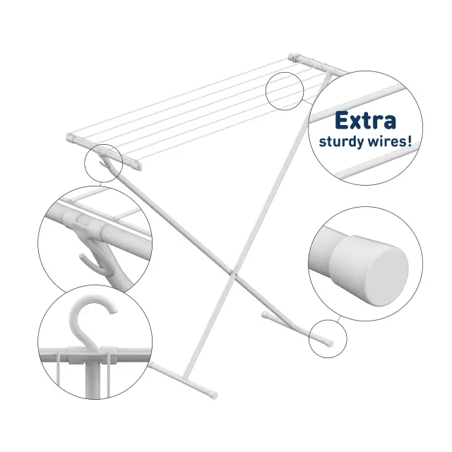 Praktično in kompaktno sušilno stojalo, posebej zasnovano za manjše količine perila, kot so športna oblačila, otroška zunanja oblačila, brisače ali kopalni kostumi. Ima kavelj, ki omogoča enostavno obešanje v omari, ko ni v uporabi.