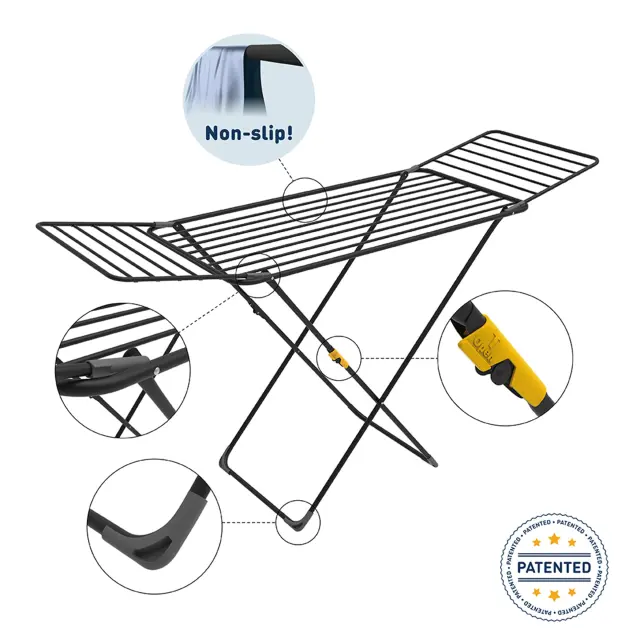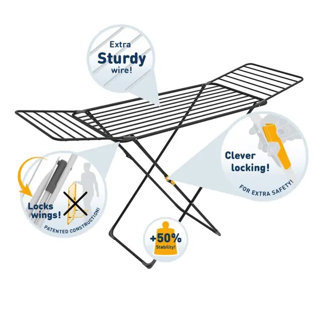Stojalo Shape združuje eleganten dizajn z izjemno funkcionalnostjo. Njegova čvrsta konstrukcija z merami 56×176×88 cm in cevmi premera 16 mm zagotavlja vrhunsko stabilnost med uporabo. Opremljeno je z izjemno vzdržljivimi sušilnimi vrvmi s skupno dolžino 18 m, kar omogoča optimalno kroženje zraka med oblačili in občutno skrajša čas sušenja. Zaradi patentirane konstrukcije so krila v zaprtem položaju blokirana, kar močno olajša rokovanje in shranjevanje, ko stojalo ni v uporabi. Shape tehta le 4,1 kg, zato ga je zelo enostavno zložiti in razpreti. Poleg tega ima stabilen zapiralni mehanizem, ki noge drži trdno v odprtem položaju in tako poveča varnost med uporabo. Njegove robustne noge zagotavljajo dodatno stabilnost in omogočajo sočasno sušenje velike količine perila.