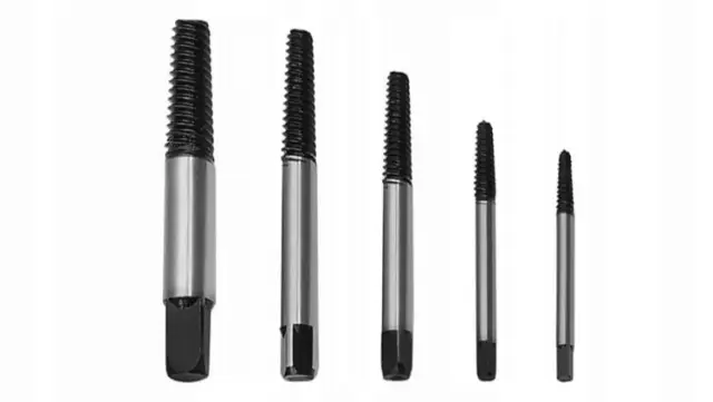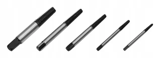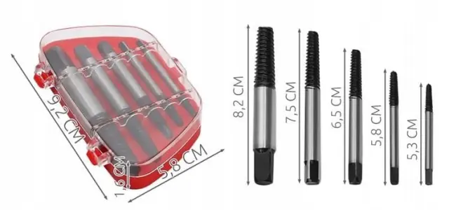 Svedri za odstranjevanje poškodovanih vijakov, komplet s petimi svedri. Vsak sveder z dvojnim delovanjem prevrta glavo vijaka, ki ga potem z lahkoto odstranimo.