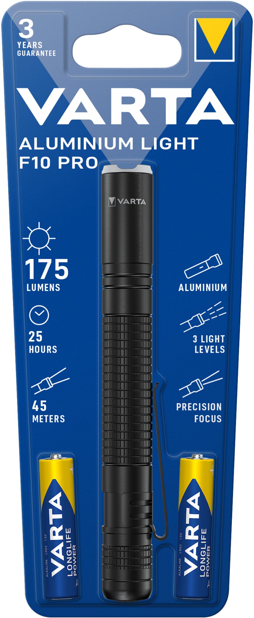 LED svetilka VARTA Aluminium Light Pro F10 je odlična izbira za vsako uporabo. Brezčasna, moderna in hkrati robustna, zahvaljujoč črnemu eloksiranemu aluminijastemu ohišju in leči, odpornima proti udarcem, ter teksturiranemu ohišju za udoben dotik in občutek. Visokozmogljiva LED dioda z do 175 lm in časom delovanja do 25 ur vam zagotavlja svetlo in dolgotrajno svetlobo. Tri stopnje svetlobe (visoka/nizka/utripanje), brezhibni način od spot do flood načina (premična glava), ki doseže doseg snopa do 45 m, maksimalno povečajo prilagodljivost uporabe. Zaradi kompaktne velikosti in priložene odstranljive žepne sponke je idealna za vsakodnevno uporabo v gospodinjstvu, garaži, na vrtu, v avtomobilu ali lopi, pa tudi za dejavnosti na prostem, kot so pohodništvo, sprehodi, kampiranje, sprehodi s psom, v sili in ob izpadih električne energije. Ker sta 2 bateriji AAA že priloženi, je svetilka pripravljena za uporabo.