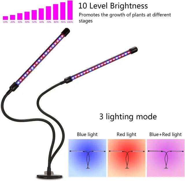 Svetilka za rastline 13 različnih nastavitev: LED svetilka ima 10 različnih stopenj zatemnitve, tako da vaše rastline dobijo točno toliko svetlosti, kot jo potrebujejo. Izbirate lahko med tremi različnimi nastavitvami svetlobe – rdeča luč, modra luč ali obe luči hkrati.