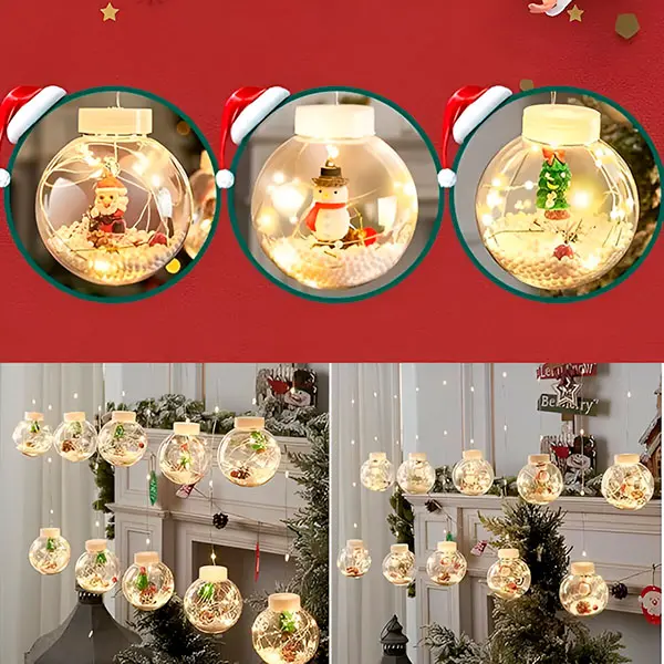 Čudovita zavesa iz svetlečih kroglic z božičnimi motivi.