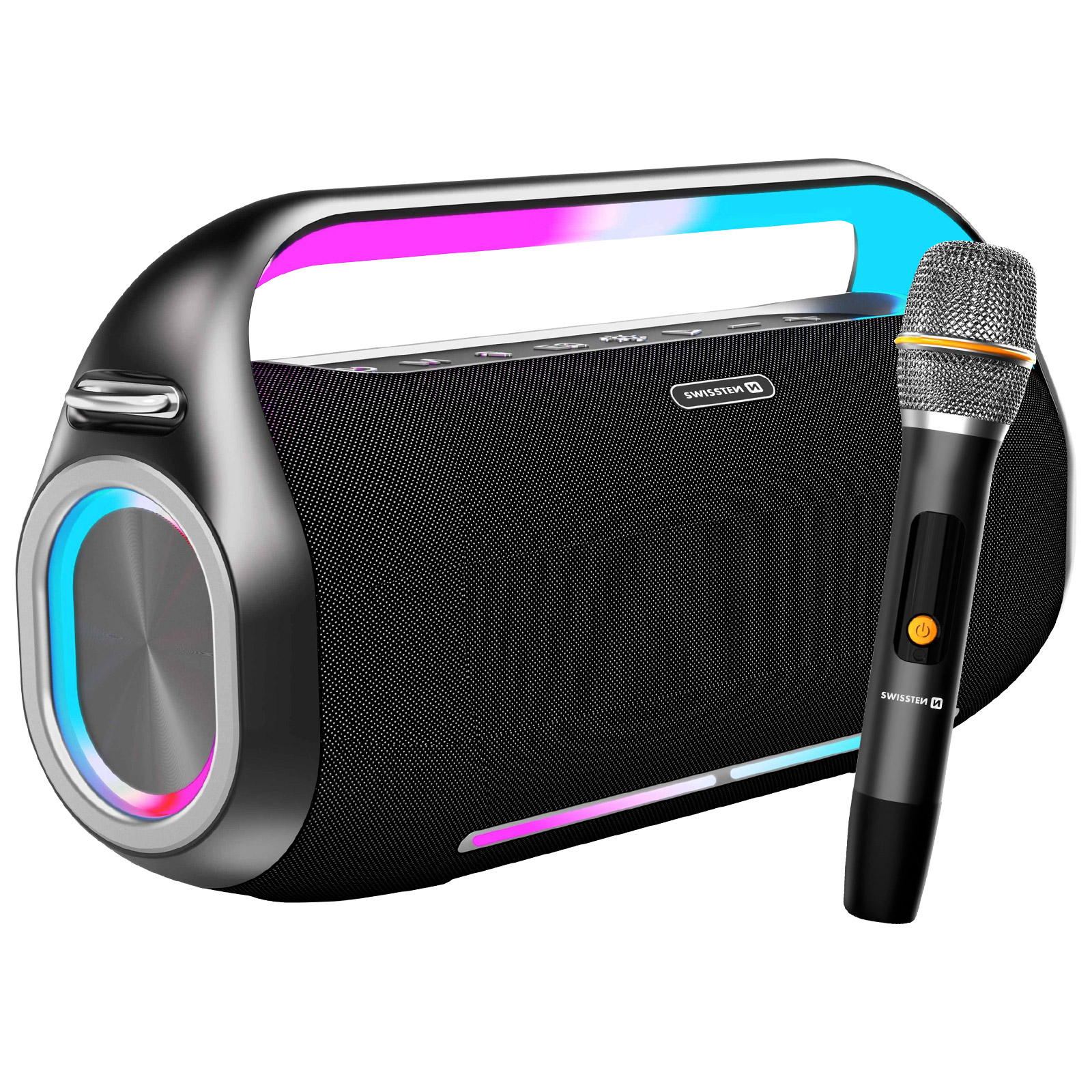 Komplet karaok vse v enem z zvočnikom Bluetooth in brezžičnim mikrofonom podjetja Swissten. Potopite se v močan 300W zvok, ki vsak prostor spremeni v koncert.. Ves dan uživajte v 15 urah neprekinjenega predvajanja glasbe. Funkcija karaok z brezžičnim mikrofonom za praznične trenutke.