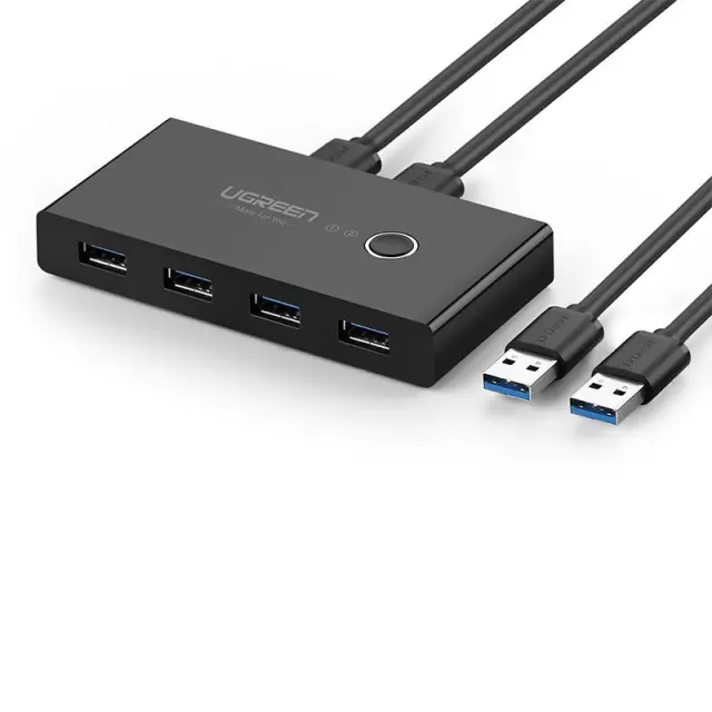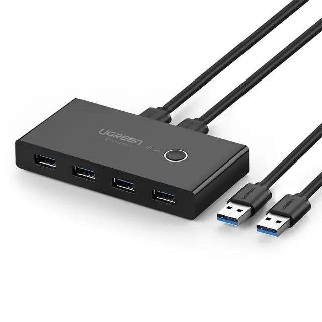 Ugreen pametno stikalo USB. Ima 4 vhode USB 3.2 Gen 1 in omogoča skupno rabo različnih naprav med dvema različnima računalnikoma. HUB deluje tako, da razdeli dostop do štirih USB vhodov med dva računalnika. Vendar ima lahko le eden od njih hkrati dostop do njih. Da bi jih drugi stroj lahko uporabljal, morate stikalo preklopiti na drugo napravo.