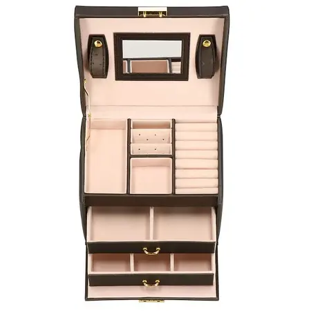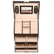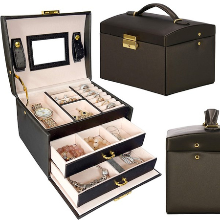 Škatla za nakit vam bo omogočila udobno in varno shranjevanje vseh vrst prstanov, verižic, zapestnic, brošk in drugih dodatkov. V našem predstavljenem primeru bo vsak dodatek dobil svoje mesto. Zahvaljujoč temu ne boste nikoli izgubili drugega uhana ali se verižice zapletle. Aktovka blagovne znamke Springos vsebuje dva predala: enega z dvema predelkoma in drugega s štirimi predelki, kamor lahko organizirate svoje dragocene predmete. Na vrhu organizatorja je pokrov s štirimi predelki, vključno z enim za prstane. Poleg tega smo na pokrovu namestili dva paščka z luknjami za uhane in ogledalo, ki olajša nadevanje nakita.