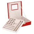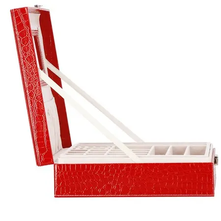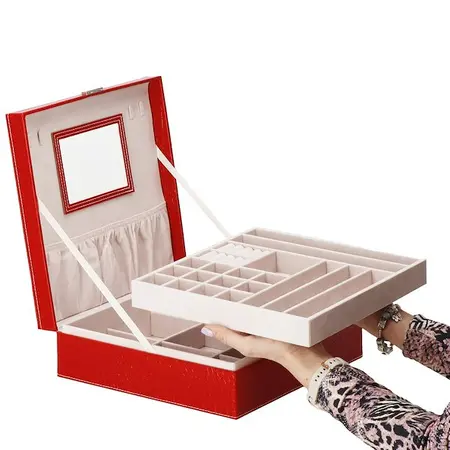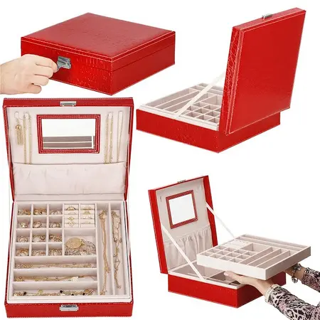 Škatla za nakit vam bo omogočila udobno in varno shranjevanje vseh vrst prstanov, verižic, zapestnic, brošk in drugih dodatkov. V našem predstavljenem primeru bo vsak dodatek dobil svoje mesto. Zahvaljujoč temu ne boste nikoli izgubili drugega ujemajočega se uhana in verižice se ne bodo zapletle. Kovček, ki ga ponuja znamka Springos, ima številne predelke, v katere lahko organizirate svoje dragocenosti. Na notranjo stran pokrova smo namestili tudi žep in kljukice. Rdeče ohišje se odlično kombinira z belimi šivi. Organizator je majhen, zato je idealen za potovanja. Doma je dobro prikazati na komodi ali komodi. Naš kovček za nakit: Pomagal vam bo organizirati vaš nakit, tako da boste brez težav našli dodatke, ki jih potrebujete. Priložen je ključ, ki poveča varnost shranjevanja. Izdelan je iz semiša, zato je popoln za shranjevanje občutljivega nakita. Parametri: Blagovna znamka: Springos® Material: eko usnje + semiš + MDF Barva ohišja: rdeča + okrasni detajli Barva notranjosti: svetlo roza Velikost zaprtega ohišja: 26 x 26 x 8,5 cm Zapiranje: dvojni zapah s ključem Notranjost ohišja: 12x majhnih predelkov : 3 x 3 cm 3x predelki: 17,5 x 2,5 cm 2x predelki: 23,5 x 2,5 cm 1x predal: 6,5 x 6,5 cm 2x predal za prstane: 6,5 x 3,5 cm ogledalo: 11 x 8 cm 4x kljukice za ogrlice 1x žep iz blaga: 25 x 9,5 cm 2 ravni: 9x predelkov: 8,5 x 8,5 cm Mere: Širina ohišja: 26 cm Višina : 8,5 cm Globina: 26 cm Koda izdelka: HA1027
