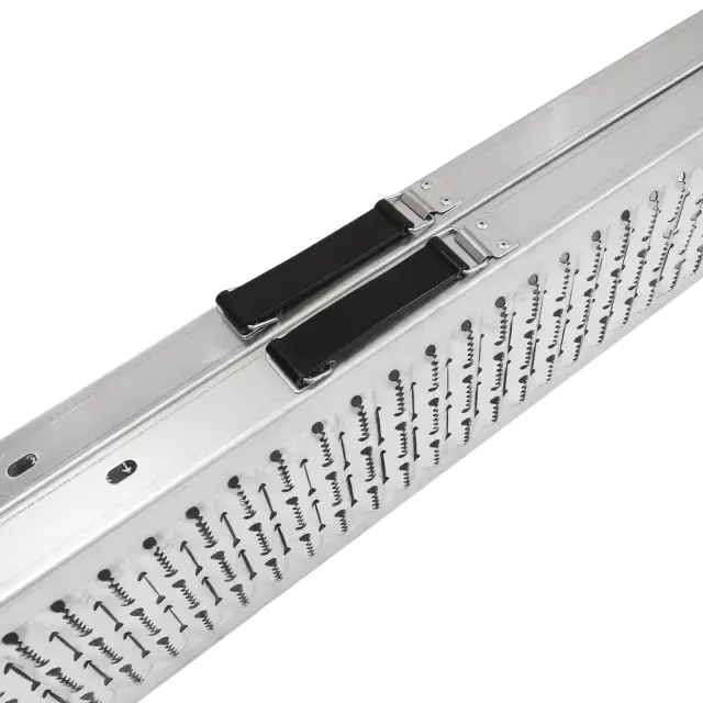 Za zagotovitev stabilnosti in varnosti sta priložena 2 brezplačna zaskočna trakova za pritrditev klančin na prikolico ali kombi pred uporabo. Ko končate, se ta priročen pripomoček zloži v kompaktno velikost – kot nalašč za shranjevanje v zadnjem delu kombija! Če že to ni bilo odlično, sta na voljo tudi dva ročaja, da lahko svoje klančine prenašate z lahkoto.