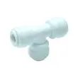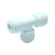 Ta kompaktni T-oblikovani priključek iz visokokakovostne plastike je idealen za sisteme za prenos tekočin, kot so vodovodne instalacije ali cevne skupščine. Njegova gladka površina in bodljaste robove na pristaniščih zagotavljajo varen oprijem cevi, medtem ko bela barva doda čist industrijski videz.