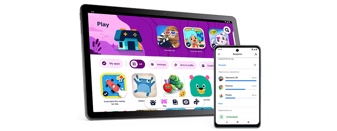 Z aplikacijo Google Kids Space,* ki je prednaložena na tablične računalnike Lenovo, lahko otroci odkrivajo, ustvarjajo in rastejo s knjižnico kakovostnih vsebin in idej za raziskovanje stvari, ki jih navdušujejo, na nove in privlačne načine. Njihove izkušnje lahko usmerjate s svoje naprave s starševskim nadzorom v aplikaciji Family Link, kjer lahko upravljate, katere vsebine so na voljo, nastavljate časovne omejitve uporabe zaslona itd.