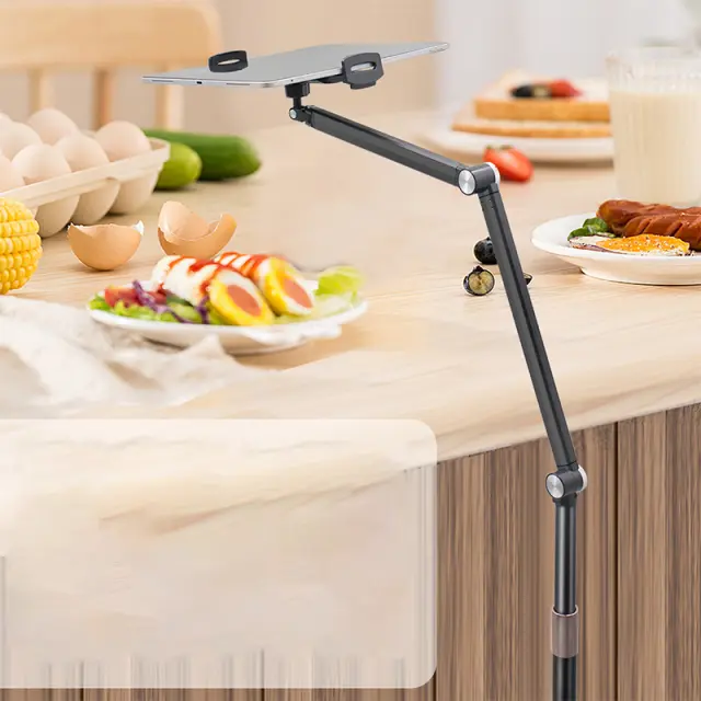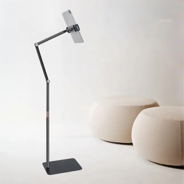 Dvojni nastavljivi roki: talno stojalo ima dvojno nastavljivo roko, ki vam omogoča prilagajanje višine in kota vaše naprave za optimalno gledanje. Vsako roko je mogoče neodvisno nastaviti, kar zagotavlja prilagodljivost za različne položaje gledanja in zmanjšuje obremenitev vratu in hrbta.