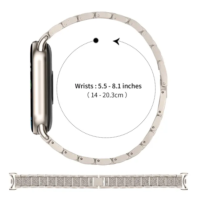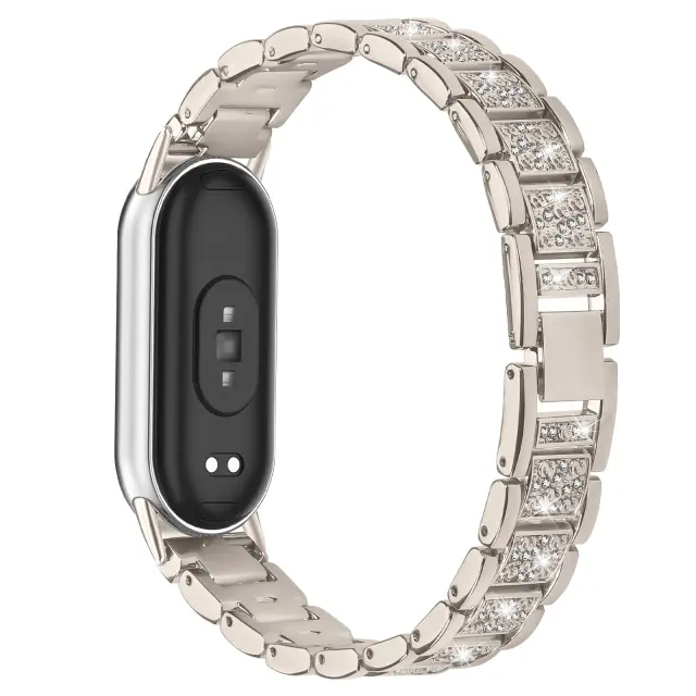 Eleganten diamantni dizajn: Povzdignite svoj Xiaomi Mi Band 8, 9 ali 10 s tem izvrstnim tankim diamantnim zapestnim pasom. Bleščeči diamantni poudarki dodajo pridih razkošja in prefinjenosti, s čimer vaš fitnes sledilnik spremenijo v eleganten dodatek, primeren za vsako priložnost. Ta pas je popoln za tiste, ki želijo združiti funkcionalnost z visoko modo, kar zagotavlja, da izstopate iz množice. Zapletene podrobnosti in bleščeči kamni lepo lovijo svetlobo, zaradi česar je osupljiv dodatek k vaši vsakdanji nošnji. Uživajte v popolni mešanici tehnologije in elegance s tem edinstvenim pasom, posutim z diamanti.