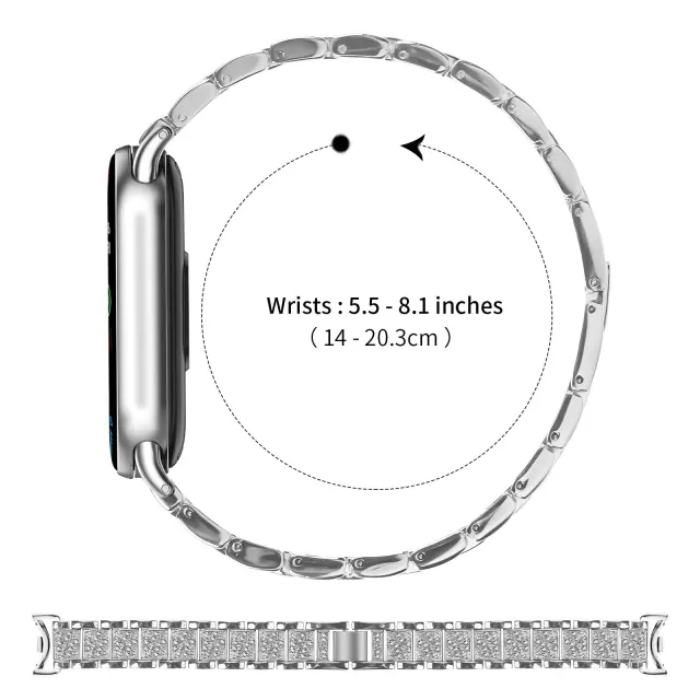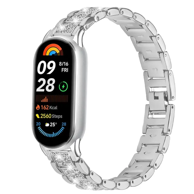 Eleganten diamantni dizajn: Povzdignite svoj Xiaomi Mi Band 8, 9 ali 10 s tem izvrstnim tankim diamantnim zapestnim pasom. Bleščeči diamantni poudarki dodajo pridih razkošja in prefinjenosti, s čimer vaš fitnes sledilnik spremenijo v eleganten dodatek, primeren za vsako priložnost. Ta pas je popoln za tiste, ki želijo združiti funkcionalnost z visoko modo, kar zagotavlja, da izstopate iz množice. Zapletene podrobnosti in bleščeči kamni lepo lovijo svetlobo, zaradi česar je osupljiv dodatek k vaši vsakdanji nošnji. Uživajte v popolni mešanici tehnologije in elegance s tem edinstvenim pasom, posutim z diamanti.