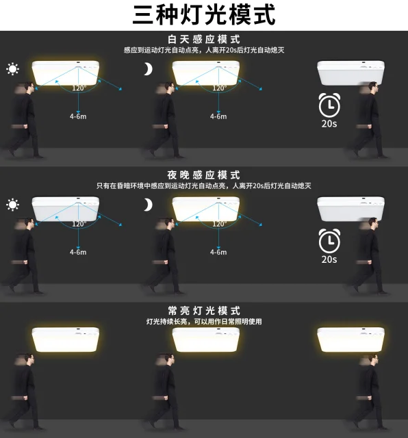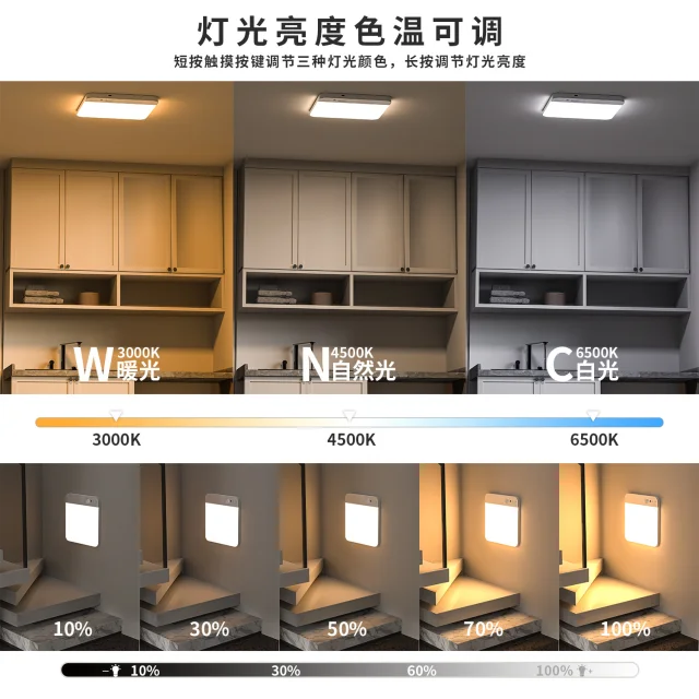 Vsestranske barvne temperature: Prilagodite svojo izkušnjo osvetlitve s tremi različnimi barvnimi temperaturami: 3000K (topla svetloba), 4500K (naravna svetloba) in 6500K (bela svetloba). Ne glede na to, ali potrebujete prijeten ambient ali svetlo delovno osvetlitev, ta LED stropna svetilka ponuja popolno nastavitev za vsako priložnost. Stropna svetilka, ki se aktivira na gibanje, je idealna za ustvarjanje pravega vzdušja v vsakem prostoru, lahko pa se uporablja tudi kot LED luči za omaro ali luč za omaro.