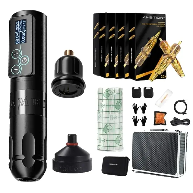 • Izhodna moč: Z uporabo močnega brezkrtačnega motorja in 2400 mAh litij-ionske baterije, Ambition Vibe Kit prenosni brezžični tatu stroj Pen zagotavlja hitrost 12V -10000RPM in nastavljivo izhodno napetost a5V-12V. LED zaslon spremlja obseg izhodne napetosti, porabo baterije in delovni čas.