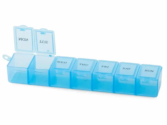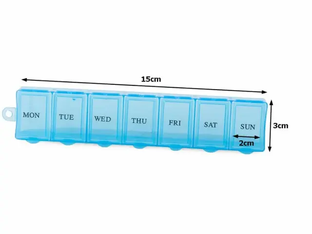 Tedenska škatlica za zdravila z ločenemi predelki več barv