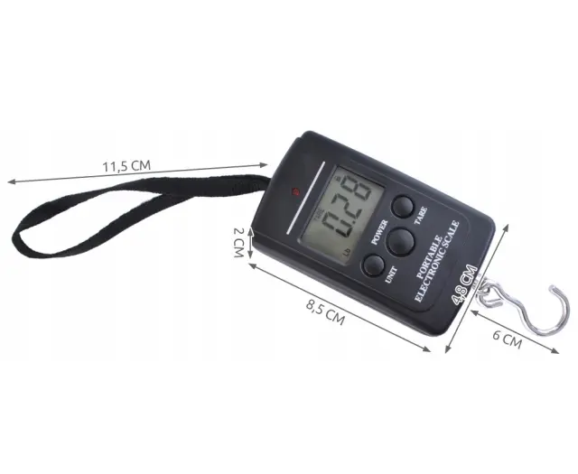 Elektronska tehtnica s kavljem bo odlična kot prtljaga ali ribja tehtnica. Je majhen in lahek, zato ga zlahka pospravite v žep ali torbico. Dioda obvešča o delovanju naprave in z utripanjem nakazuje nizko raven baterije.