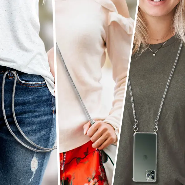 telefonski dragulj s srebrno kovinsko mrežo na dlani za elegantno prenašanje pametnega telefona. To verižico lahko pritrdite na USB kljuce, obeske za kljuce, kamere itd. Z dolžino 110 cm ga lahko nosite po želji.