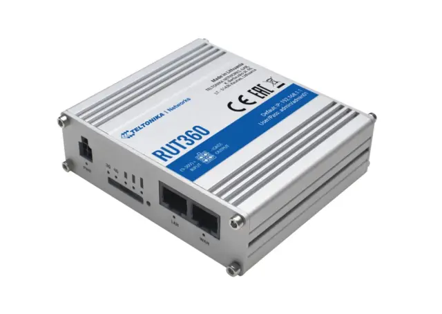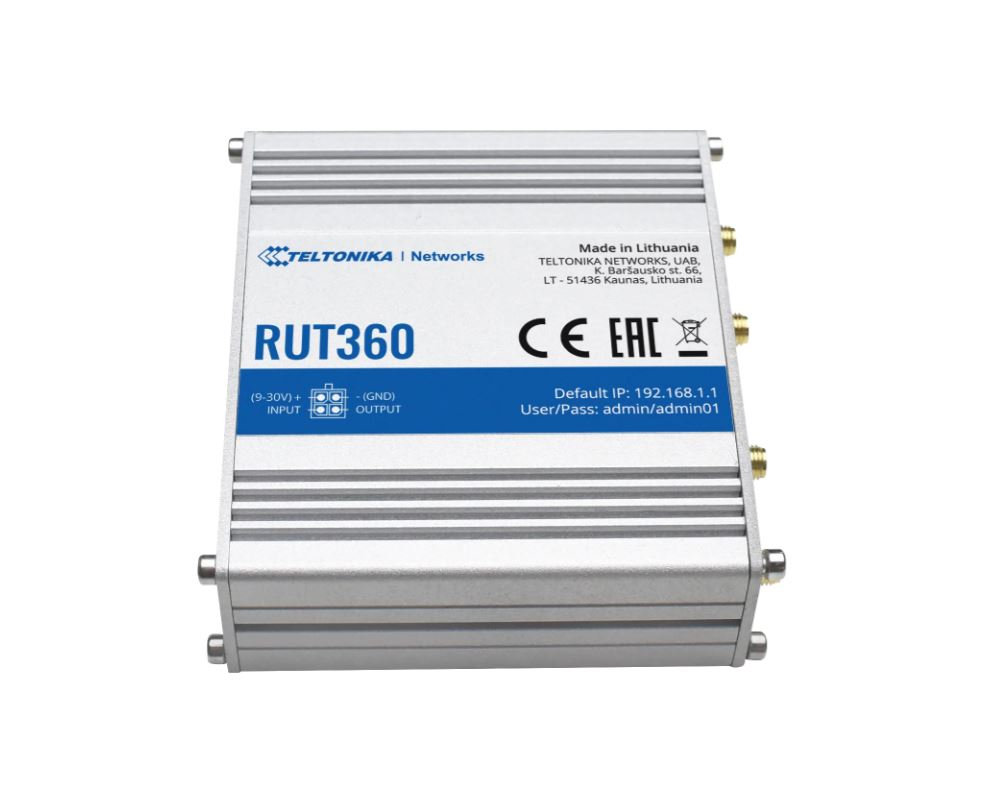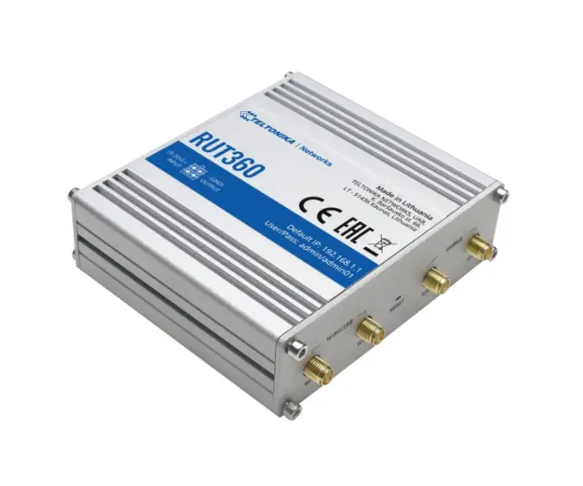 RUT360 je opremljen z dvema vmesnikoma Ethernet, 802.11 b/g/n WiFi in modulom 4G LTE Cat 6, ki ponuja podatkovne hitrosti do 300 Mbps.
