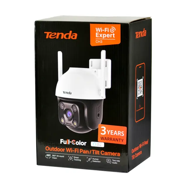 Paket vsebuje: 1x Tenda IP kamera 2.0MP brezžična PT zunanja CH3, 1x Napajalnik, 1x Montažni set, 1x Navodila