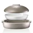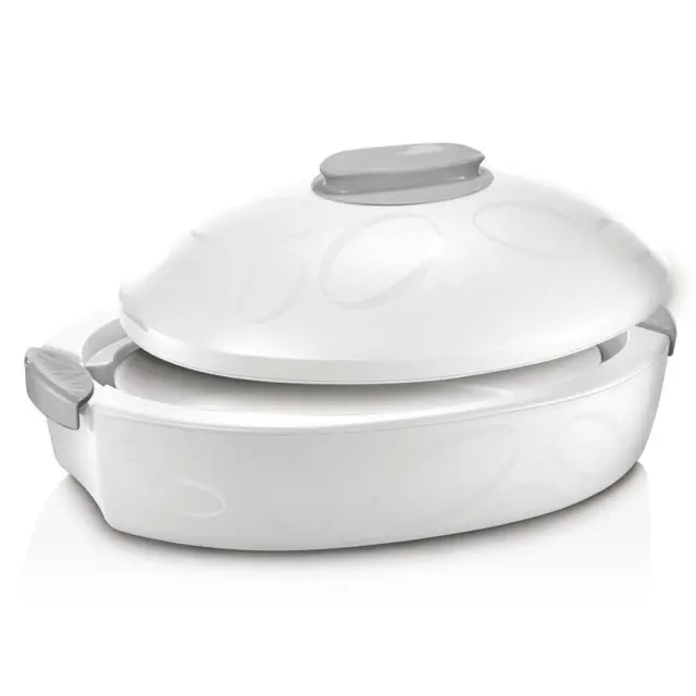NAMIG: Da bodo predhodno pripravljena živila med serviranjem ohranila temperaturo dlje časa, jih postavite v ogret pekač (pekač segrejte v pečici). Zaradi zanimive oblike in elegantnega videza lahko termo posodo postavite kar na mizo ali pa jo uporabite za različne priložnosti: na svečanih prireditvah, na piknikih, na morju, v hribih … Pekač lahko enostavno pomijete v pomivalnem stroju, plastično posodo in pokrov pa pomijte ročno. Ne uporabljajte abrazivnih sredstev.