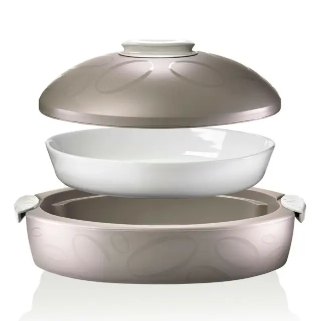 Porcelanast pekač je primeren za peko vseh vrst hrane v klasični pečici. Ne uporabljajte ga na plinu, ognju ali v mikrovalovni pečici. Termo posode in pokrova, nikoli ne postavljajte na vir energije ali v pečico.