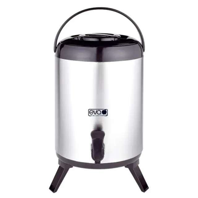 EVA TERMO POSODA Z ODTOČNO PIPO IN ZLOŽLJIVIMI NOGAMI je zaradi prostornine 9,5 l idealna za zabave in kateringe. Narejena je iz nerjavečega jekla 18/8, notranjost pa iz aluminija (dvojna stena), ki ohranja temperaturo toplih pijač (nad 55 °C) do 8 ur in hladnih (pod 16 °C) prav tako do 8 ur. Termo posoda je primerna za kavo, čaj, sokove … Priročno držalo vam bo olajšalo prenašanje posode.
