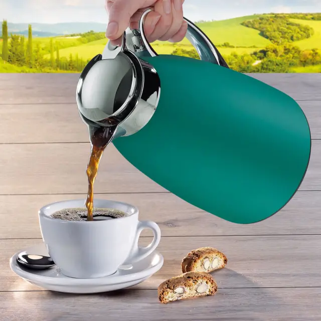 Vakuumski termo vrč Venezia blagovne znamke Cilio (1 L) združuje eleganco in vrhunsko funkcionalnost. Temno zelena zunanjost iz nerjavečega jekla daje vrču poseben prestižen videz. Robusten vložek iz kaljenega stekla zagotavlja izvrstno izolacijo, saj pijača ostaja topla do 12 ur, hladna pa do 24 ur. Priročen gumb za vlivanje omogoča enostavno postrežbo kar z eno roko. Ni primerno za pomivanje v pomivalnem stroju.