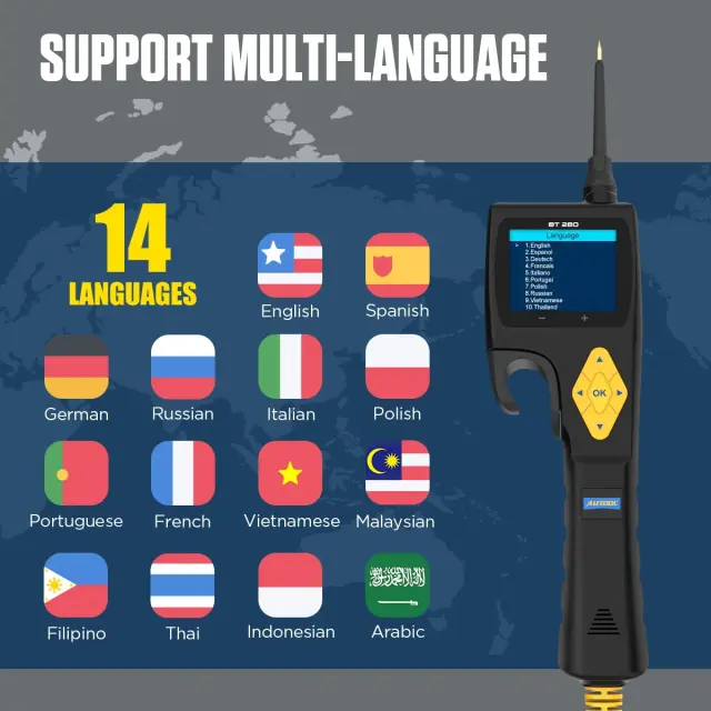 • Podpora jeziku in garancija: Podpira 14 jezikov in je podprt z 3-letno garancijo ter doživotnim vzdrževanjem za škodo, ki ni posledica človeškega faktorja, AUTOOL BT280 zagotavlja enostavno delovanje in dolgo zanesljivost.