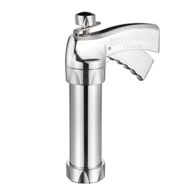 18 DELNI IMPERIA TESTOMAT ZA PIŠKOTE COOKIES 580 je izdelan iz litega aluminija in je primeren za dekoriranje in izdelavo piškotov. V setu je 14 različnih matric za pripravo keksov različnih oblik in 4 »šobe« za dekoriranje. Vstavite nastavek in s testom napolnite testomat ter navpično iztisnite piškote na pripravljen pekač. Ergonomsko oblikovana ročica za stikanje (pištola) zagotavlja preprosto in natančno doziranje. Priložena je tudi knjižica receptov.