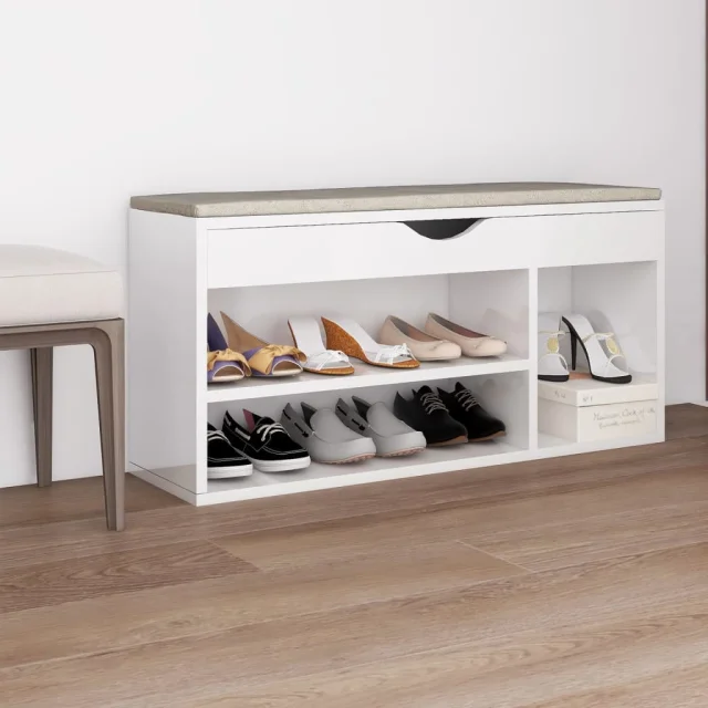 The Living Store Klop za čevlje z blazino visok sijaj bela 104x30x49 cm - Klop Za Čevlje