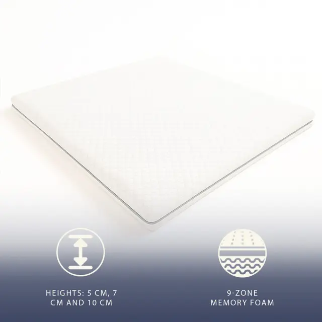 MEMORY FOAM TOPPER Z 9 CONAMI. Topper iz visokokakovostne spominske pene, zasnovan z 9 conami različne nosilnosti za natančno podporo vsakega dela telesa. Višina 5 cm omogoča odlično prilagajanje naravnim krivinam telesa in izboljšuje poravnavo hrbtenice. Struktura omogoča pravilno razporeditev telesne teže in zmanjšuje pritisk na sklepe in mišice. KOREKTOR LEŽIŠČA. Idealen za izboljšanje udobja pretrdega ali obrabljenega ležišča. Memory foam topper izboljšuje kakovost spanja s spodbujanjem sprostitve mišic. Pomaga zmanjšati bolečine v križu in sklepih ter nudi ergonomsko podporo. Oživi posteljo brez potrebe po nakupu novega ležišča. PRIMEREN ZA VSE POTREBE. Popoln kot korektor za ležišča, raztegljive kavče, zložljive in terenske postelje. Vsestranska rešitev za domačo ali profesionalno uporabo. Primeren tudi za hotele, B&B-je, počitniške hiše, hostle in zdravstvene ustanove. Hitro izboljša udobje vsake spalne površine zaradi ergonomske in zračne zasnove. HIPOALERGENE IN ANTIBAKTERIJSKE TKANINE. Opremljen s hipoalergeno, antibakterijsko in zračno prevleko, ki je popolnoma snemljiva z zadrgo. Izdelan iz certificiranih in varnih materialov, nudi zaščito pred bakterijami, pršicami in alergeni. Priznan kot medicinski pripomoček razreda 1. NAMESTITEV IN VZDRŽEVANJE. Toperji so dostavljeni zviti in vakuumsko pakirani. Po odprtju je potrebno nekaj ur, da topper ponovno dobi svojo obliko. Dolgo življenjsko dobo zagotavlja enostavno vzdrževanje: redno obračanje glava-noge in zgoraj-spodaj. Prevleka je snemljiva in pralna v pralnem stroju pri nizkih temperaturah.