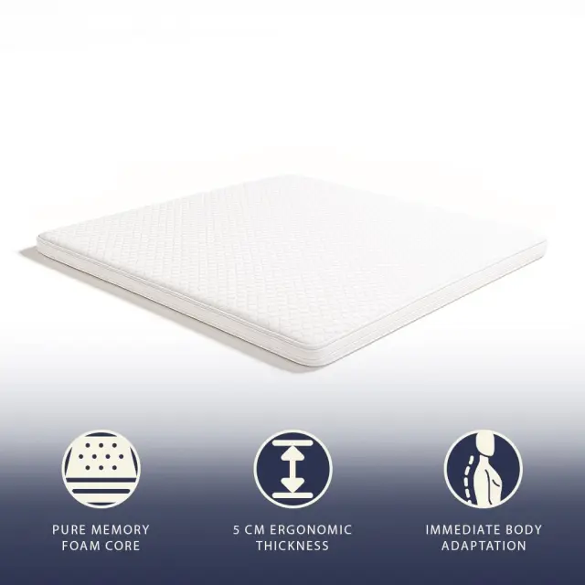 ČISTI MEMORY FOAM ZA GLOBOKO SPANJE. 5 cm debela plast čistega Memory Foam se popolnoma prilega telesnim krivuljam, enakomerno razporeja težo in zmanjšuje točke pritiska. Idealno za izboljšanje kakovosti spanja na vseh vrstah vzmetnic. Ta ergonomska nadvložek zagotavlja takojšen občutek udobja in pomaga zmanjšati bolečine v vratu, hrbtu in mišicah. Rezultat? Globok in regenerativni spanec noč za nočjo.
