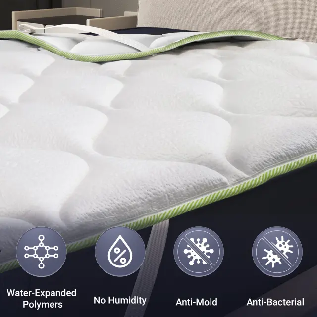 Topper Artic Cold je prekrit z materialom ICE FLAKES s tehnologijo Cooler, ki med počitkom nudi občutek svežine in zmanjšuje telesno toploto. Polnilo iz SOFT vate 400g/m² in 2 cm plast pene iz vodnih polimerov izboljšata udobje, kar je idealno za vroče noči, saj preoblikuje posteljo v oazo dobrega počutja. Ergonomski topper The White Stone nudi podporo zaradi waterfoam pene, ki se prilagaja obliki telesa in izboljšuje poravnavo hrbtenice. Polnilo iz SOFT vate zmanjšuje pritisk na kritičnih točkah, kar pomaga zmanjšati mišične in sklepne bolečine. Popoln za regenerativni spanec, izboljšuje podporo žimnice. To je idealna rešitev za obnavljanje pretrdih ali izrabljenih žimnic. Polnilo enakomerno porazdeli težo, s čimer zmanjša pritisk na hrbet in sklepe. Kvadrirana struktura in elastike v kotih zagotavljajo stabilnost med nočnim počitkom. Topper je hipoalergen, antibakterijski in zelo zračen, preprečuje nabiranje vlage in zmanjšuje rast pršic ter bakterij. Osnova iz mikrovlaken (83g/m²) dodaja trpežnost in stabilnost. Pošiljanje je varno, topper je zložen in vakuumsko zvit za enostavno uporabo in higieno. Po razpakiranju topper hitro doseže svojo prvotno višino v nekaj urah. Podpora za stranke je vedno na voljo za vse potrebe.